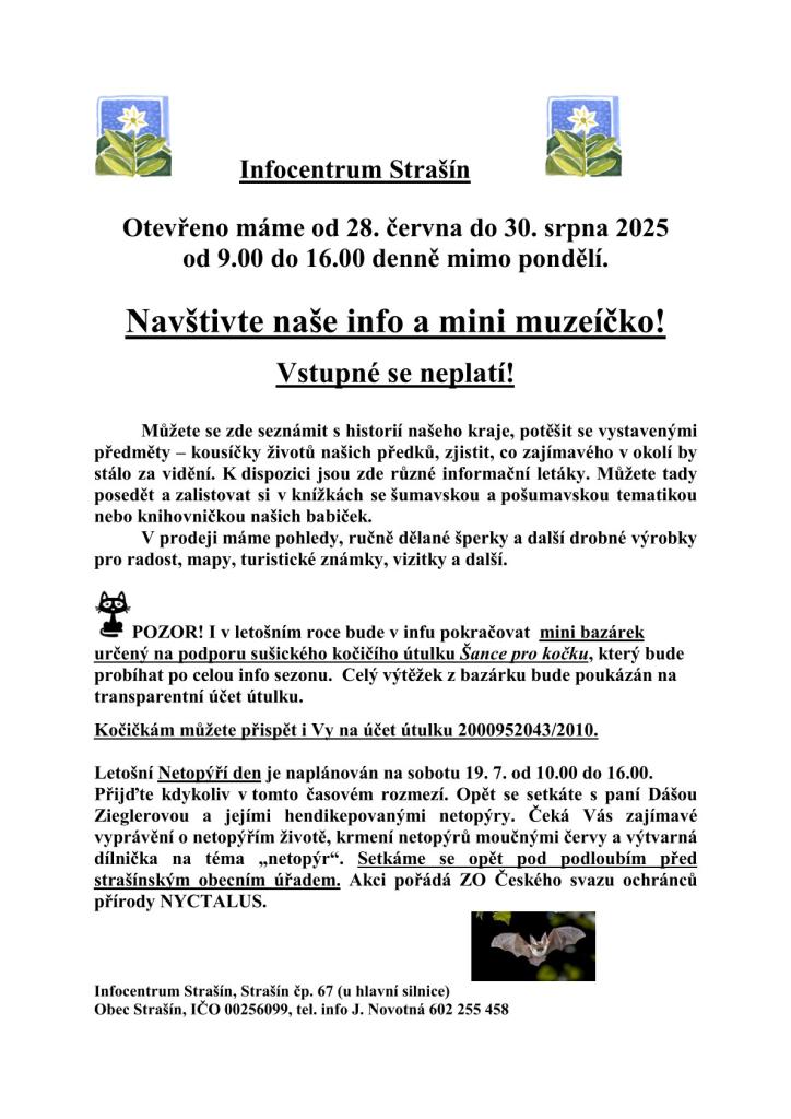 Infocentrum Strašín bude mít otevřeno od 28.6 do 30.8 od 9:00 - 16:00 denně mimo pondělí.