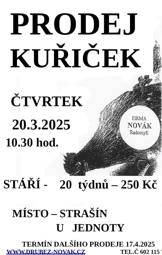 Ve čtvrtek 20.3 proběhne od 10:30 před ZKD Strašín prodej kuřic od firmy Novák Radomyšl
