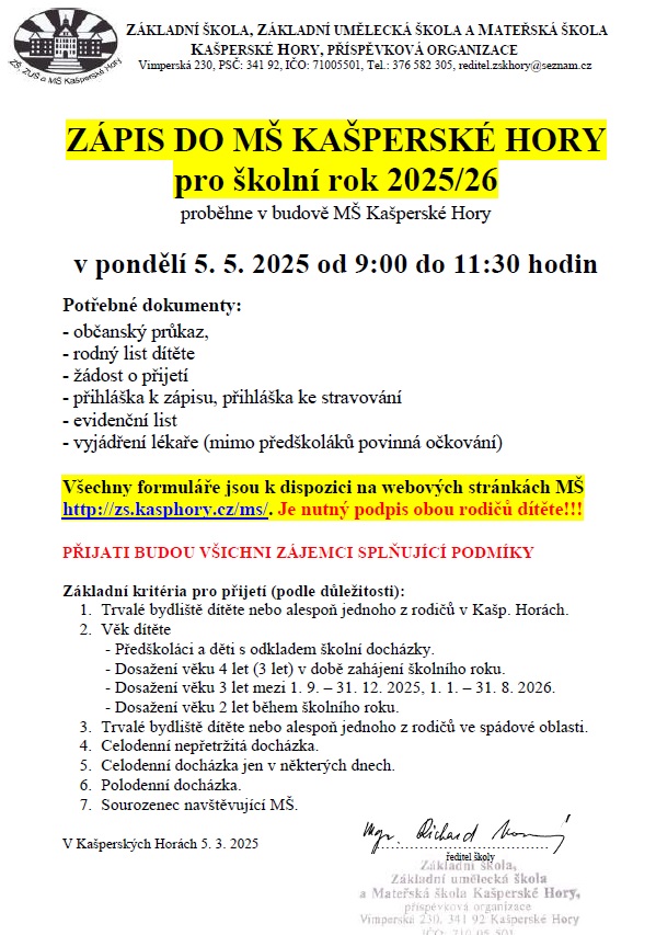 Zápis do MŠ Kašperské Hory